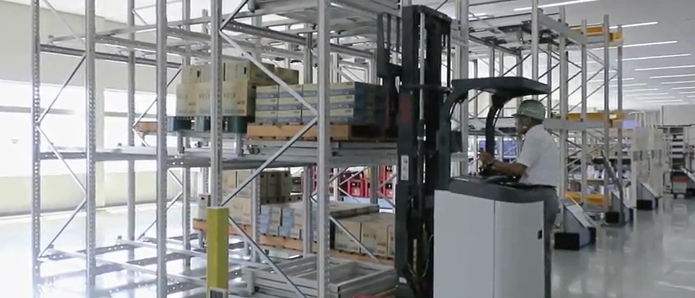 従来のドライブインラックは、固定棚と比べて格納効率が高いものの、フォークリフトで狭い通路に出入りして作業を行うため、作業効率が低く熟練度が必要でした。
