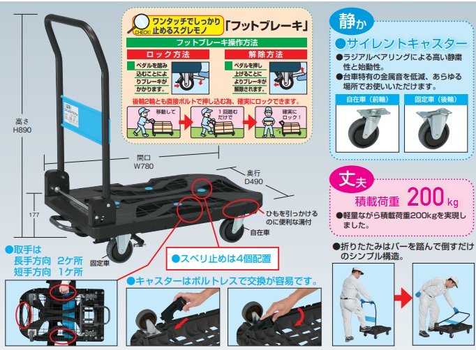 軽くて丈夫な手押し台車にブレーキ付が新登場